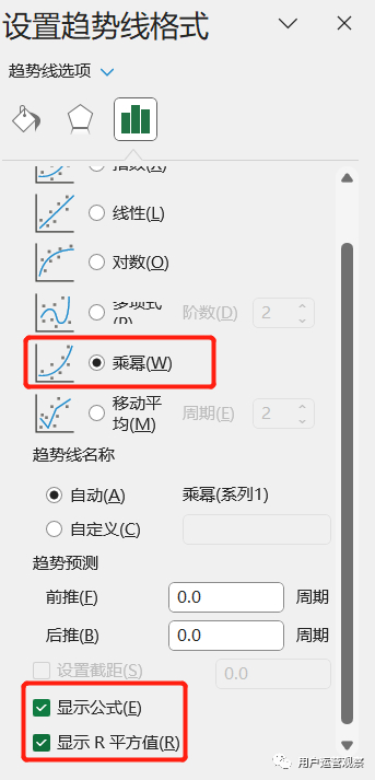 使用以上的30天留存数据先生成一个散点图,然后插入趋势线,选择幂函数,下方的显示公式和显示R方都选中,这样就得到留存率的拟合图和公式。