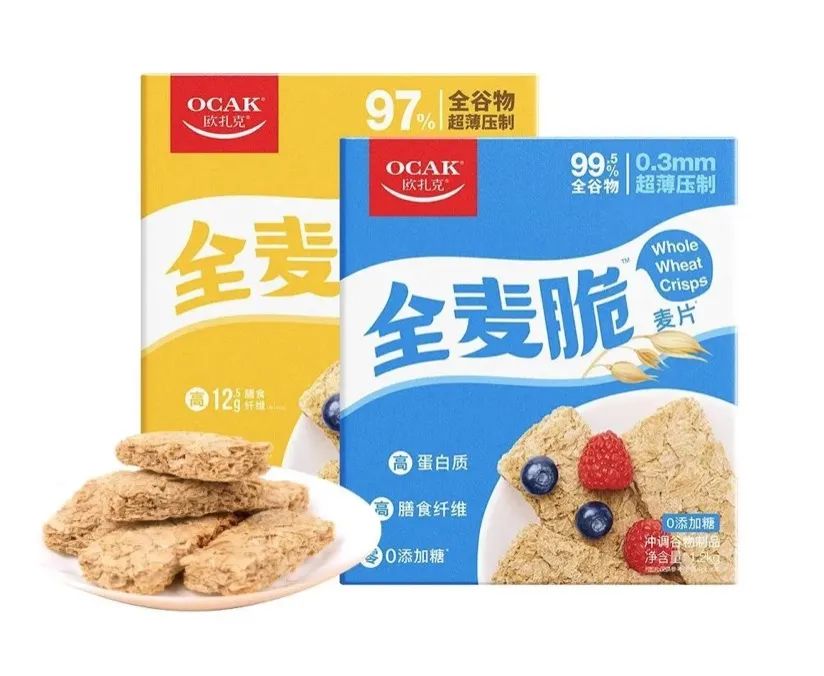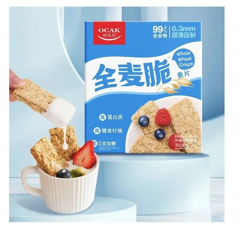 顺应年轻人健康消费升级的大趋势,欧扎克又乘胜追击,2022年10月推出一款国内首创的全麦脆产品,希望用低糖低脂、高营养的专业产品,撬开年轻人的健康早餐新赛道。