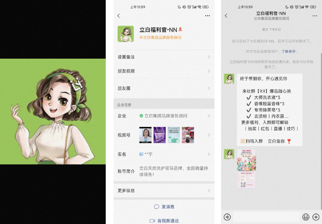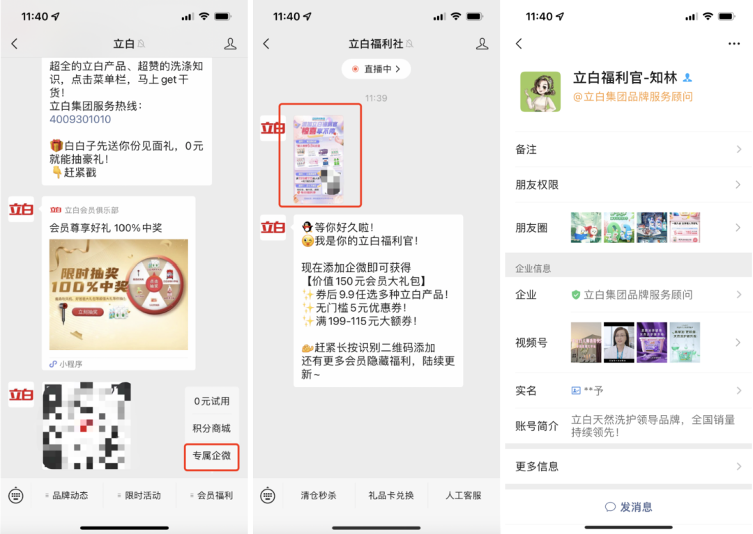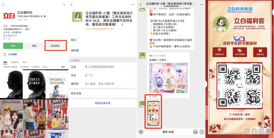 在公众号「立白」的菜单栏中,有「专属企微」的引流渠道,点击可以直接添加企微福利官;在关注公众号「立白福利社」后,会自动发送福利海报,附带企微二维码,引导用户添加。