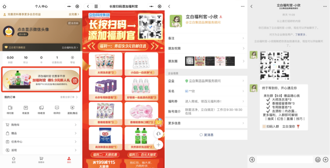 引流路径(1):在【立白官方旗舰店】的个人中心,利用【加福利官得9.9元新人礼】的福利吸引用户点击,跳转福利页面,长按即可扫码添加企微,添加成功后自动发送群二维码。