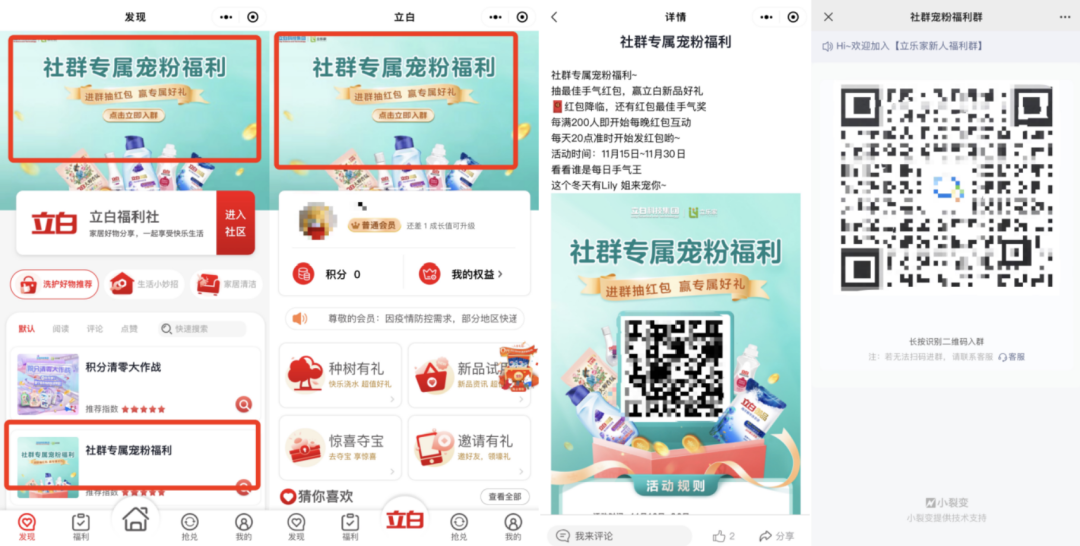引流路径(2):在【立白会员俱乐部】的首页和发现页,有【社群专属宠粉福利】海报吸引用户点击,点击进入活动详情页面,保存后,扫码直接进入新人福利群。