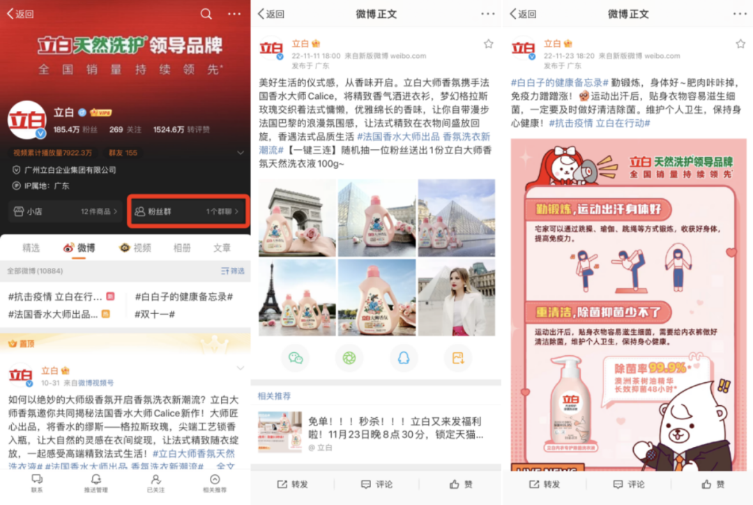 立白在微博有185.4万粉丝,主要内容以话题互动、产品种草、新品发布、有奖互动为主。