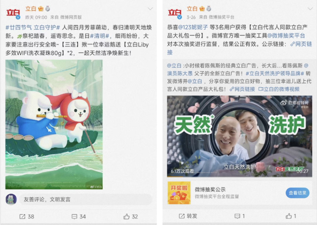 立白在微博官方账号上抽奖活动更为频繁,一般每周都有2-3次。不同的是,有时会与其他品牌进行联合推广,提升品牌曝光。