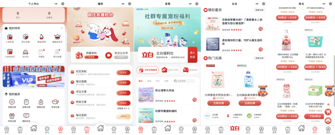 立白主要运营两个小程序,分别是【立白官方旗舰店】和【立白会员俱乐部】。