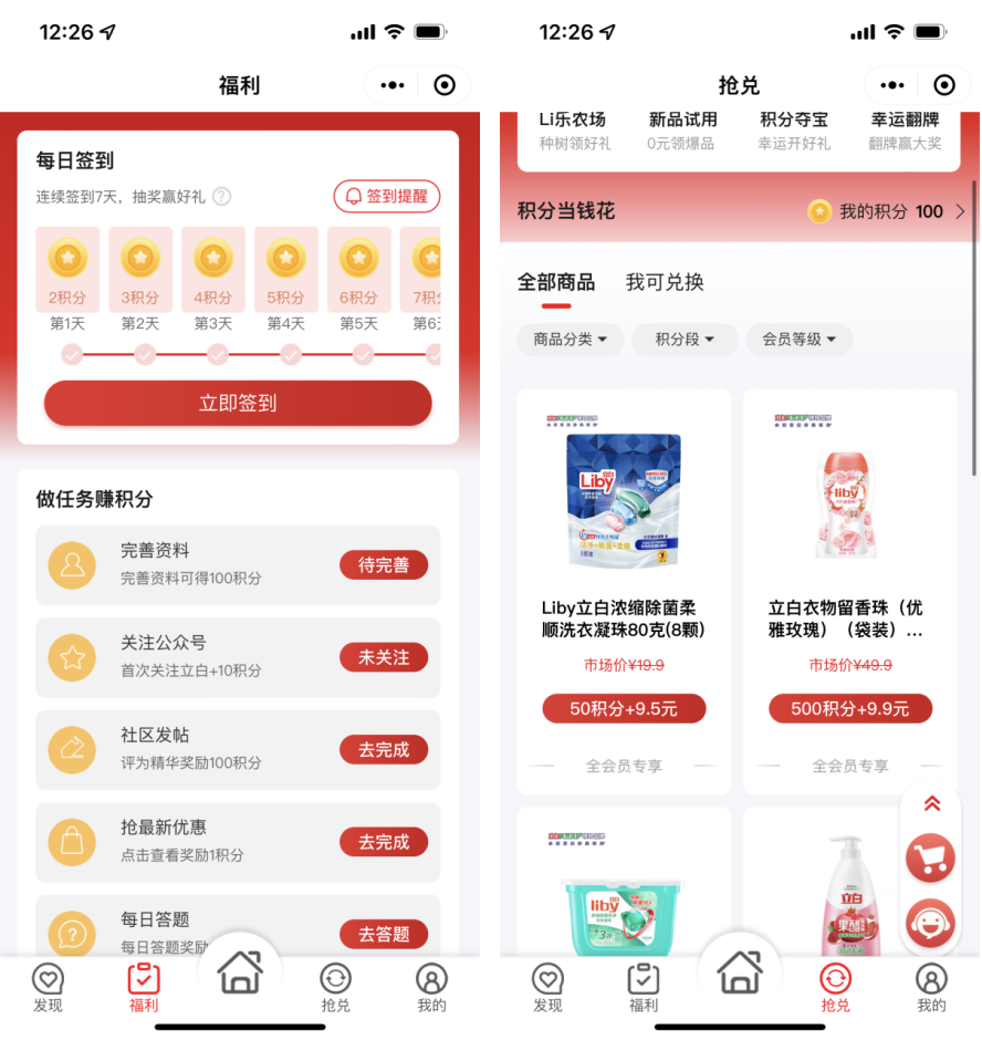 会员积分可通过签到、答题、发帖、互动等途径获取。积分可在积分商城中加现金换购,或免费兑换洗衣凝珠、方巾、肥皂、洗衣液等产品。