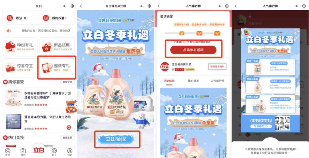 以立白冬季礼遇活动为例,参与方式步骤:用户报名——生成助力海报——分享好友——扫码助力——领取奖品。