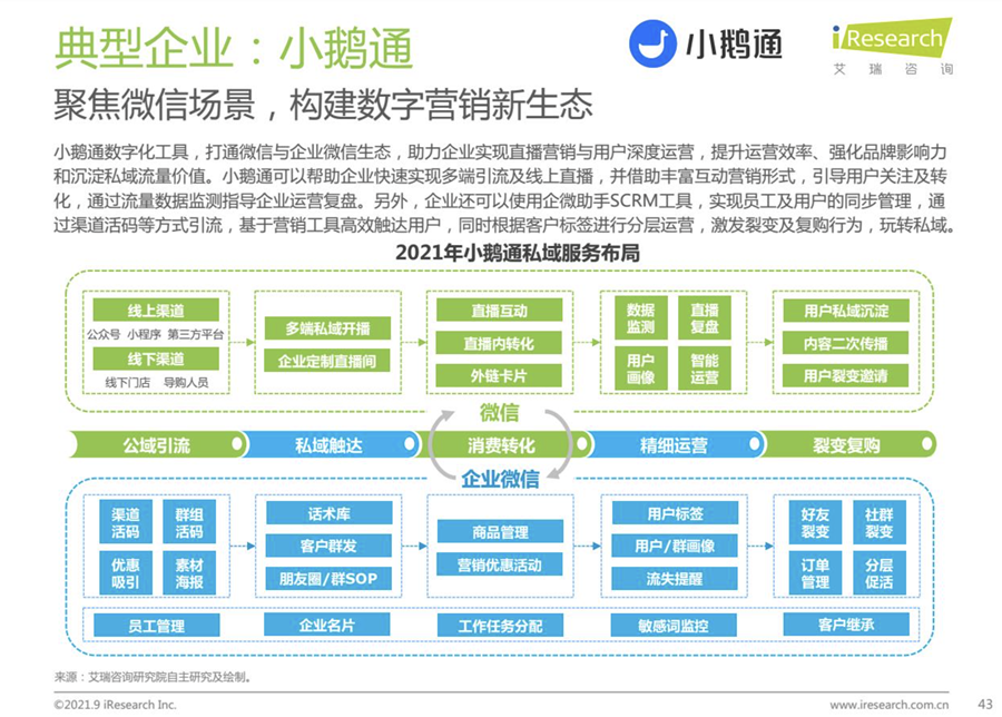 2)从用户端看,微信可提供多种途径将用户引流至品牌私域,如朋友圈广告、公众号、视频号等,围绕社群运营及内容推送增强用户粘性,通过小程序商城、直播等实现购买转化。