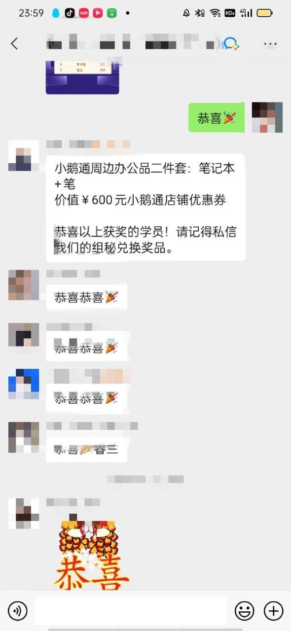 获得前十名的学员会获得600、400、200不同程度的课程优惠券+小鹅通通通公仔、笔记本、文具套装、小鹅通杯子等奖励,从而完成留存;
