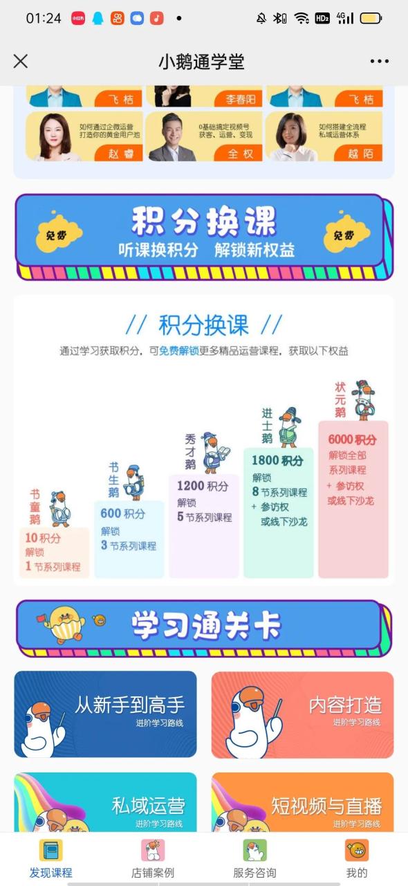 且也有采用成长体系+积分激励体系相结合的方式,书童鹅10积分、书生鹅600积分、秀才鹅1200积分、进士鹅1800积分、状元鹅6000积分的方式,来完成用户留存;不同程度的用户会获得不同数量的积分换课听,及进阶权益(小鹅通线下参观权+线下沙龙)。