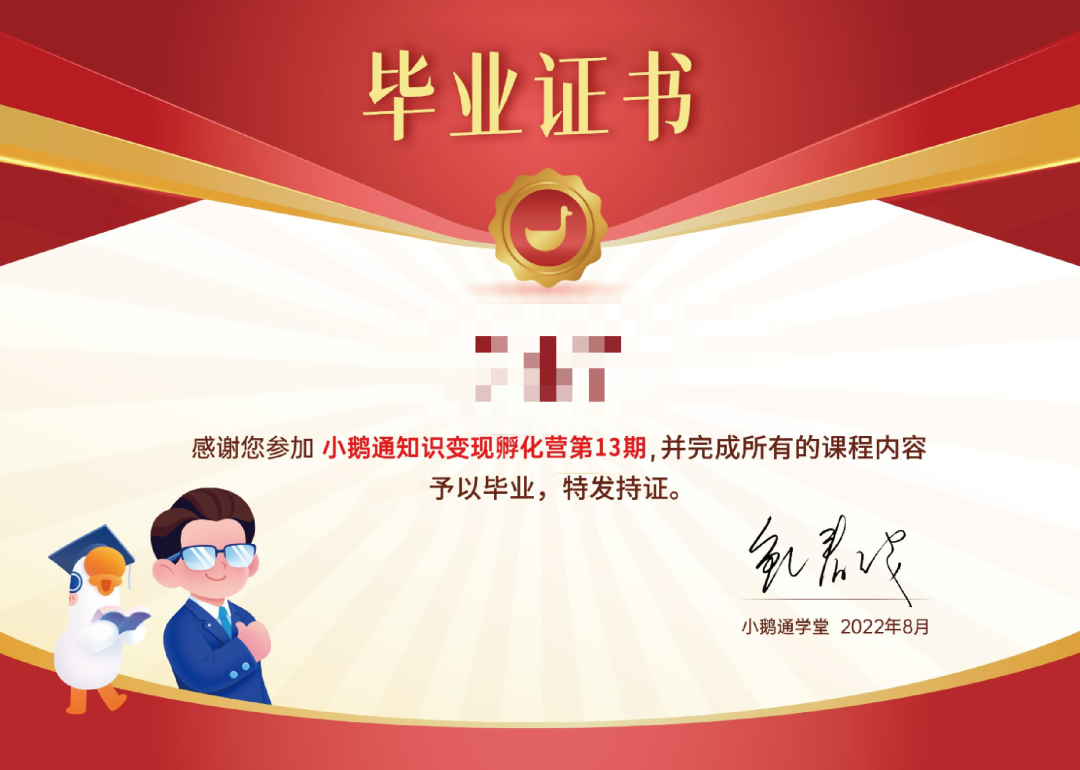 当用户学习完“3天知识变现孵化营”全部的内容+完成每天作业打卡的任务后会获得一张电子版的毕业证书+小鹅通商家的运营地图。这样可以让用户有晒朋友圈的动力或让用户感知到自己的用心是有被尊重的感觉,这就起到了精神激励的作用。