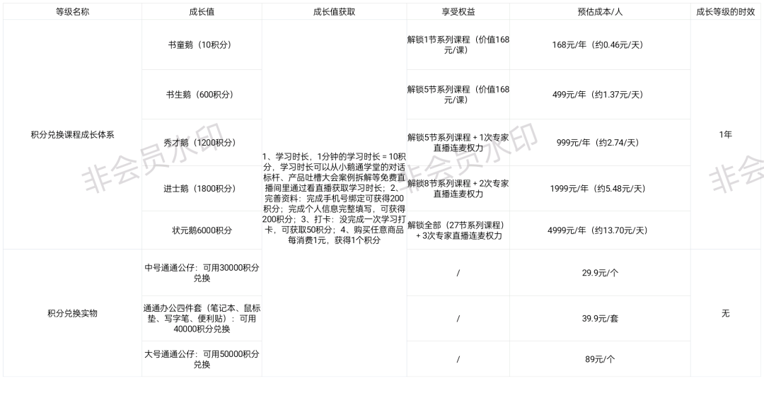 2)能够持续带来利润持续性动作:用户通过学习时长的累积,都可以按照1分钟学习时长兑换10个积分(1/10),10、600、1200、1800、6000、30000、40000、50000积分兑换相关权益,且兑换某一种权益,积分直接清零,不可叠加,可以使用户朝着更高积分兑换,可以提升高等级用户量级,实现量的指标增长。使高等级用户有一定的尊享感和省钱感知;会员成长等级体系三种体系方式都有显示:成长等级权益会员+积分会员+成长勋章会员。
