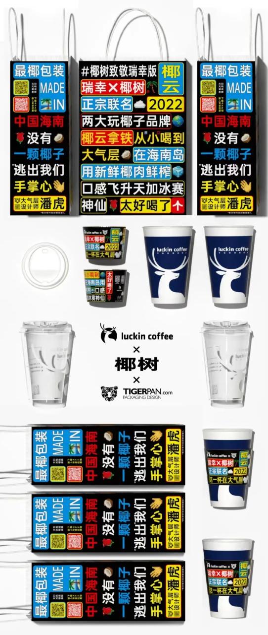 在为瑞幸咖啡 x 椰树椰汁x潘虎设计的三方联名产品“椰云拿铁”设计包装时,潘虎也在包装设计中保留了椰树标志性的排版特征,并加入了小巧思——用类似于弹幕、弹框的效果,和像素风的小图标,引发用户的二次创作。