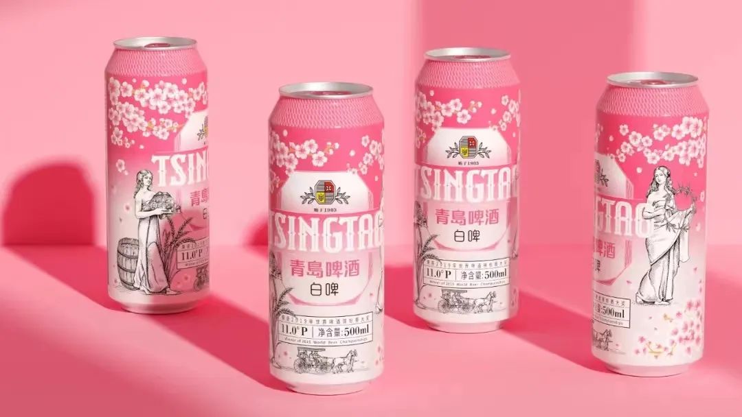 青岛白啤新包装的课题是“和年轻人沟通”。为了达到这个目的,潘虎提取了白啤中的花果香气这个特点,并通过设计将其突出。青岛白啤得到市场的成功反馈后,潘虎和品牌紧接着推出樱花季、玫瑰红系列,大胆采用粉色、红色,使之具备社交属性。