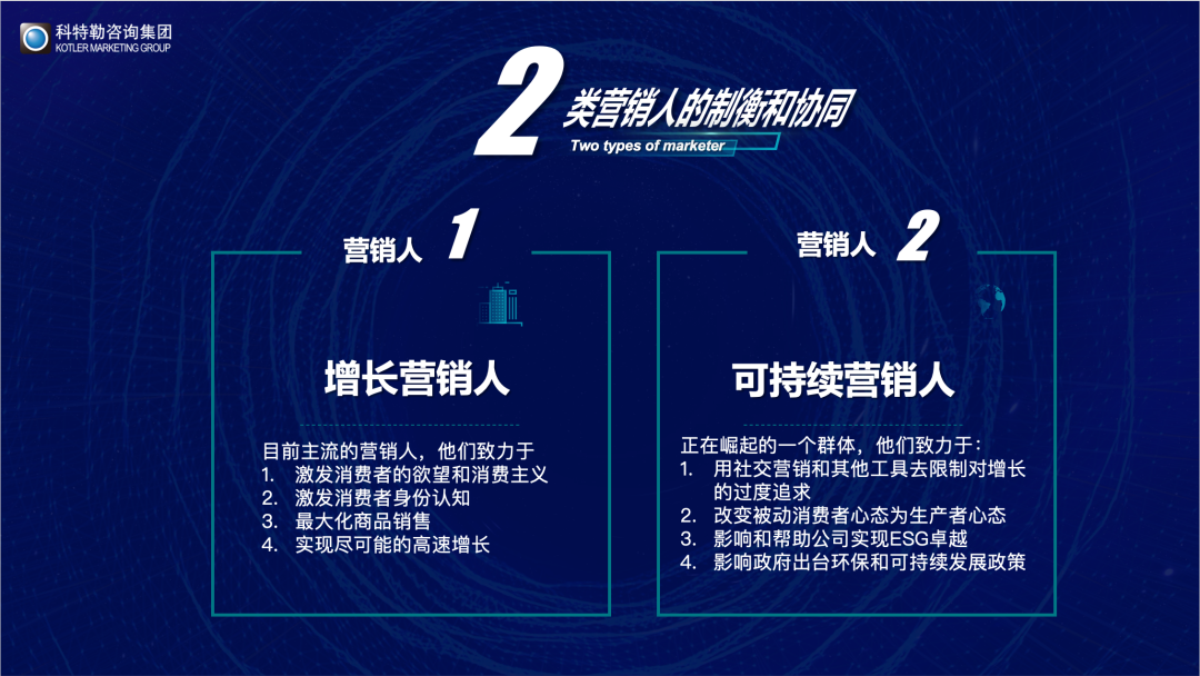 但同时我们组织当中还有第二类营销人,叫作可持续营销人。这一类营销人他的工作是什么?他要站在一个更高的价值维度,用社交营销社交工具去影响消费者,去影响公司,去影响政府的政策制定。