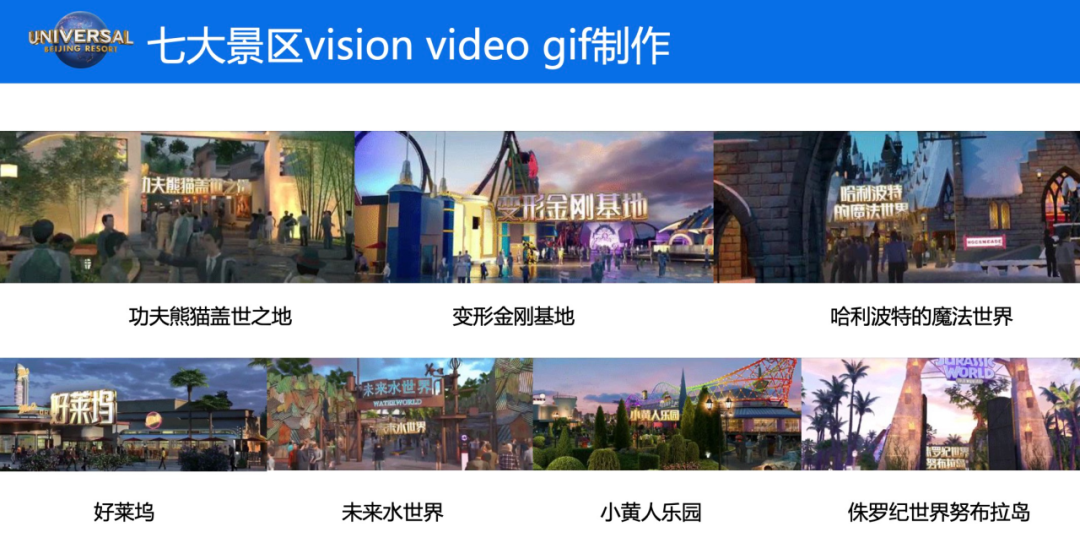 如对当时七大景区的官宣配合发布明星祝福视频,配合功夫熊猫项目和侏罗纪项目实现H5互动,配合变形金刚项目采访视频来实现创意营销互动。
