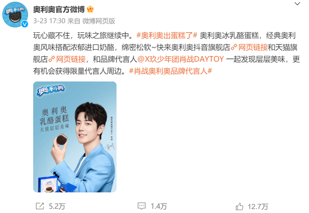 奥利奥作为国民度和口碑非常好的品牌,一直以来都受到大家的喜爱,在肖战官宣成为首席代言人后,更是直接激活了粉丝经济的强大实力。