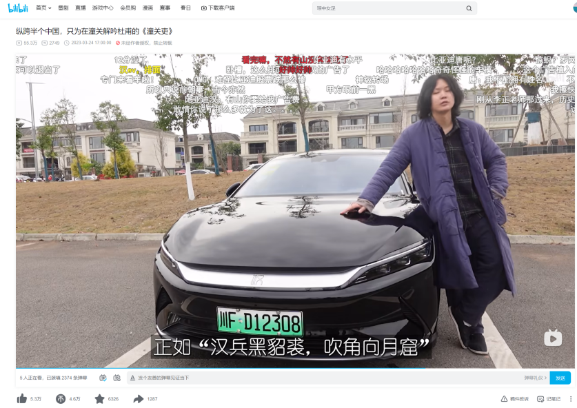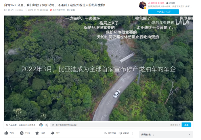 这种做法充分利用了UP主的价值,发挥他们各自的内容优势,呈现个人的独特经历与感悟,比如在遴选出的10位UP主之中,有古文学UP主开着比亚迪汉去潼关吟诵杜甫《潼关吏》,科普UP主开着比亚迪驱逐舰05去热带雨林寻访珍稀生物。