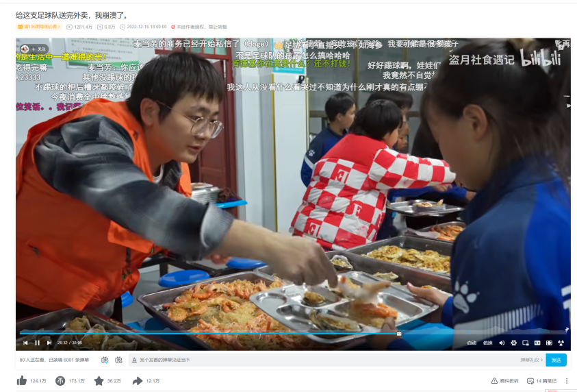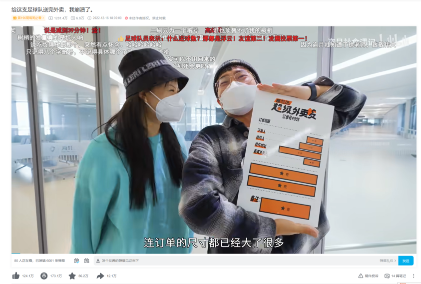 我们再来看广汽丰田威兰达和UP主“盗月社食遇记”合作的《超级外卖员》。盗月社是美食区UP主,也是B站2022百大UP主,《超级外卖员》是他们打造的一档内容节目,目标是要接最难的订单,送不可能的外卖。