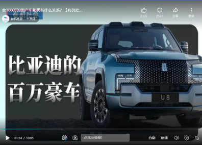 其中就有一条知识区UP主“有机社会”创作的视频《卖100万的国产车和我有什么关系?》,对比亚迪发布的高端汽车品牌“仰望”,以及车上搭载的“易四方”四轮独立电机技术进行了详细科普和生动讲解。
