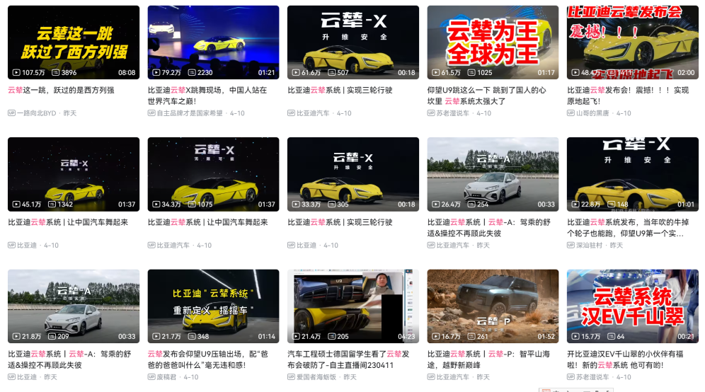 而最近,比亚迪打造的新能源专属智能车身控制系统“云辇”,短短三天时间内,在B站上也已经有众多视频,从技术原理、品牌情怀、动态展示、实用价值等多角度切入去解读这一技术品牌。