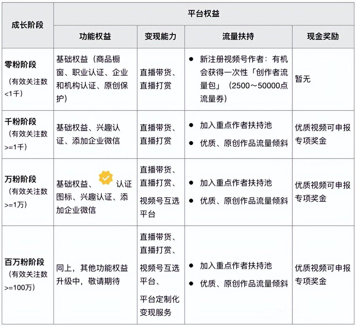针对新入驻视频号的作者,视频号团队会根据作者在短视频行业的影响力评级有机会获得一次性「创作者流量包」2500~50000点不等的流量券。比如:行业头部、腰部作者可参照如下标准,通过参与平台相关活动,获取相应流量奖励。