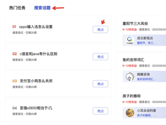 一 如何参与搜索话题 1、路径1 登录百家号PC端后台—首页中部位置—搜索话题—选择抢占普通灵感词 或 pk玩法中擅长的灵感词抢占并创作。 2、路径2 登录百家号PC端后台—左侧导航栏【搜索专区】—【搜索话题】—选择「本周热门」 或「PK悬赏」中擅长的灵感词抢占并创作。 二 多种玩法 1、抢占玩法 在「本周热门」抢占感兴趣的灵感后,进行内容创作,经百家号审核成功即可享受搜索流量收益。抢占玩法下的所… -