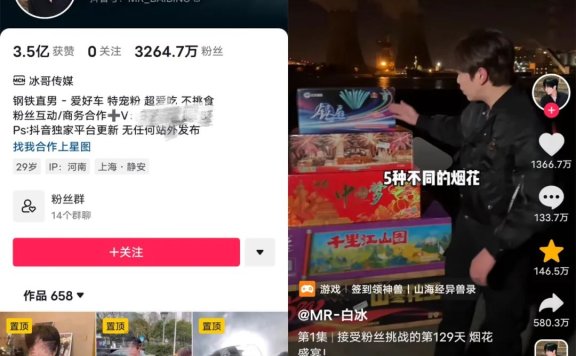 过年的时候,竟然真的有大网红看到了里面的流量密码,拍烟花视频发布,而且是抖音顶级网红@白冰。 1月25日他砸了几万元,拍了一条烟花秀视频,点赞超过1300万,成为今年抖音最火视频。粉丝数狂涨60万,现在总粉丝数高达3264万。 估计连@白冰自己都没想到,这条视频会成为他658条视频里面最火的一条,点赞数比平时翻了14倍,他平时的视频点赞数大约是100万。 最最最重要!这条视频的成本非常低,只要小几…- 534