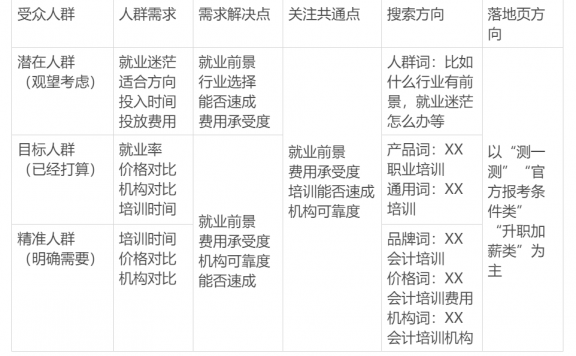 本篇给大家分享的是职业培训行业SEM推广案例。下面就以会计培训为例给大家详细讲解。 1、目标人群分析 2、推广结构建议 建议 按产品划分计划(如初级会计培训、中级会计培训、高级会计培训),且分开PC及移动端推广计划,不同端口出价策略、创意策略等均不一样,更好的追踪端口转化效果,以便后期做好预算分配。 建议 按关键词词性划分单元,比如培训词、课程词、地域词等,这样有利于创意撰写,不同类别词,针对性不…- 773