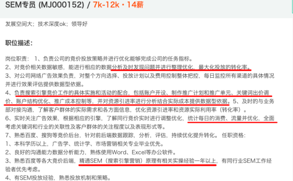 SEM优化师和优化师之间薪资差距还是有的,除了技能以外,面试也起到关键的作用。有的优化师可以拿到比实际技能高的薪资,有的可能拿到的就比实际技能低的薪资,也就是被低估了,那么我们如何才能拿到比自己技能稍微高一些的薪资呢?几个技巧分享来了。 01 简历印象分 大家应该都做过简历,今天也不是专门分享简历制作的,我就捡一个最关键的分享一下。 简历最重要的写作手法就是数据化,你并不需要写诸如“我优化能力强、…- 802